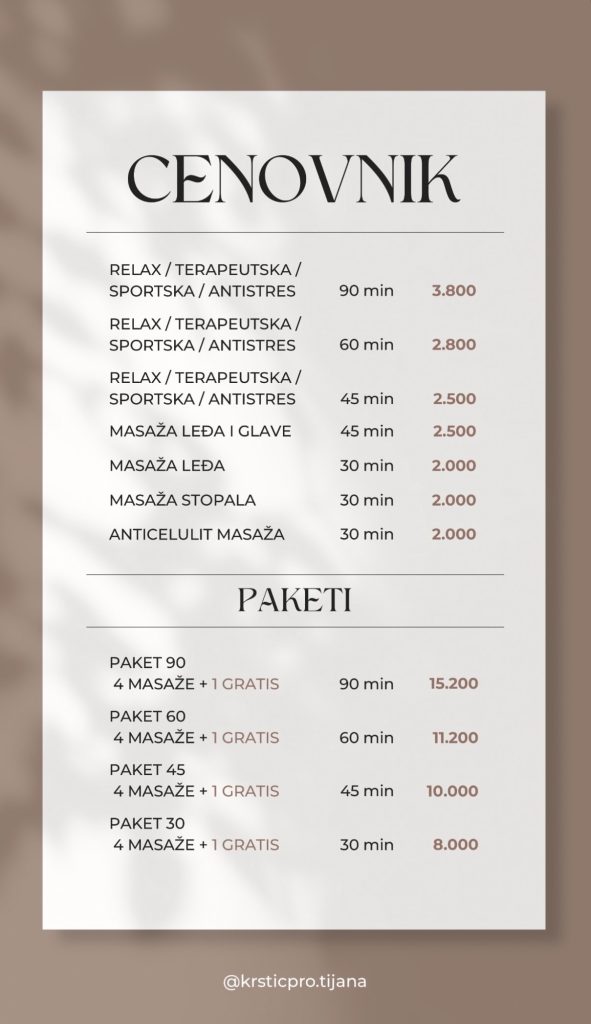 Želim da moj centar za masažu bude vaša oaza mira, prema svakom klijentu imam individualan pristup i cilj mi je da iz mog salona izađete bez stresa, opušteni i spremni za nove pobede!
